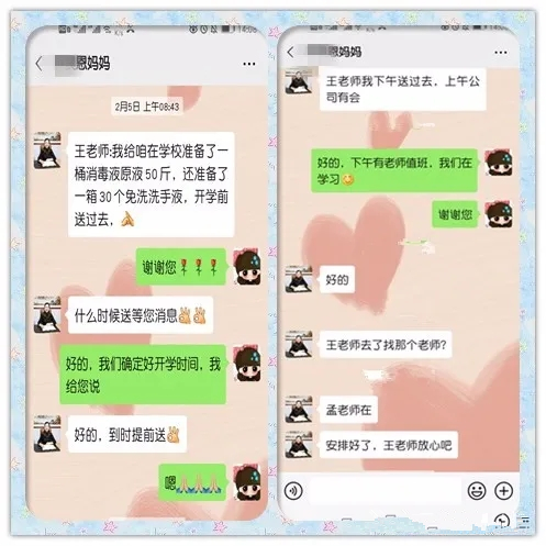 在全國疫情爆發(fā)后,學(xué)校恩恩寶貝的家長一直惦記著學(xué)校的寶貝們,第一時(shí)間與王藝然老師取得聯(lián)系,表示要向?qū)W校捐贈(zèng)84消毒液、抑菌洗手液等防疫物資,用于開學(xué)后學(xué)校疫情防控。