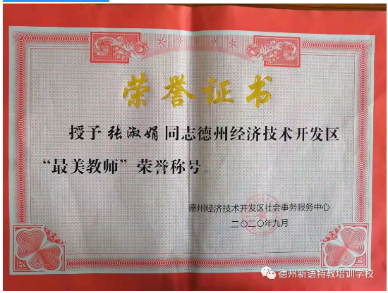 賀德州新語特教培訓(xùn)學(xué)校張淑娟老師榮獲德州經(jīng)濟(jì)技術(shù)開發(fā)區(qū)“最美教師”榮譽(yù)稱號(hào)。