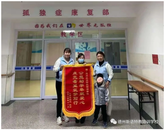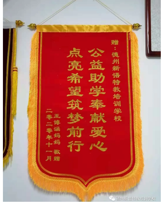 11月12日上午。涵涵(化名)媽媽母子來到德州新語,送上“公益助學(xué)奉獻(xiàn)愛心,點(diǎn)亮希望逐夢前行”的錦旗,表達(dá)自己對學(xué)校和老師的感激之情。