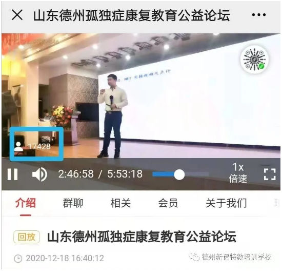 為加強(qiáng)社會對孤獨(dú)癥兒童的關(guān)注度,讓每一名孤獨(dú)癥兒童都能享受正常的生活,2020年12月18日,由山東德州新語特教培訓(xùn)學(xué)校主辦,山東德州星雨特殊兒童家長互助中心協(xié)辦的,為期兩天的第五屆山東德州孤獨(dú)癥康復(fù)教育公益論壇,在德州凱元溫泉度假村酒店三樓會議中心正式開課。因疫情原因,會場內(nèi)學(xué)員控制在300人以內(nèi),論壇全程直播,截止目前,直播觀看累計(jì)17428人次。