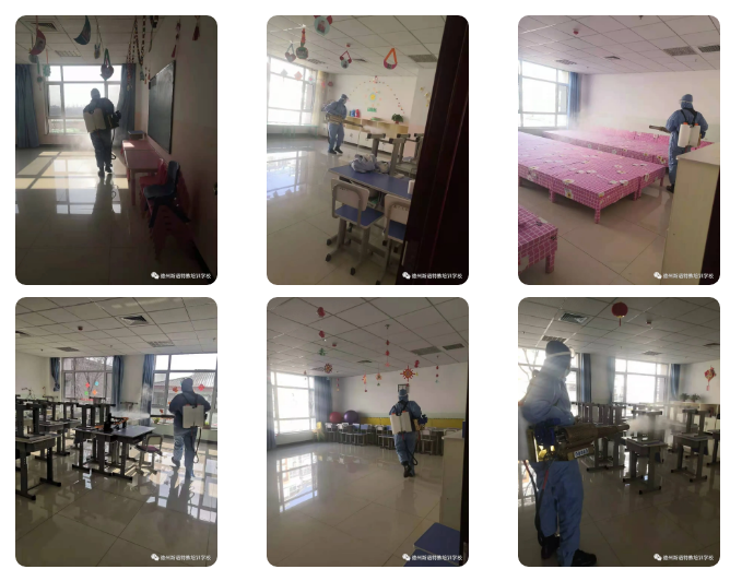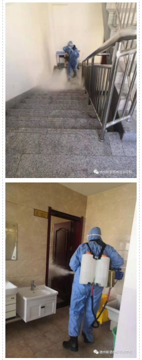 每個校區(qū),每個教室、大廳、廁所、走廊、操場一一消毒,不留死角。