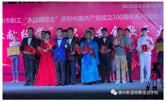 2021年6月23日,德州新語特教培訓(xùn)學(xué)校老師袁振魯、于洋、侯建鵬三位老師參加了由德州市總工會(huì)主辦的德州市“頌歌獻(xiàn)給黨”職工業(yè)余歌手大賽,共有49組參賽選手參加了這次大賽,其中我校于洋、侯建鵬二位老師在活動(dòng)中榮獲三等獎(jiǎng)!