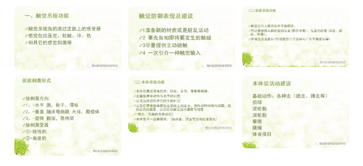 重點講述了觸覺、前庭、和本體三大感覺系統(tǒng),分別闡述了三種感覺系統(tǒng)未發(fā)育好的表現(xiàn),并給出活動建議。