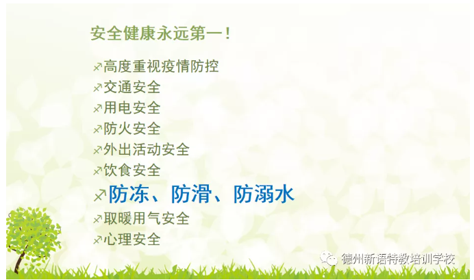 孟老師從疫情防控、交通、用電、防火、飲食、防凍、防滑、防溺水等九個(gè)方面講述了安全注意事項(xiàng),尤其是冬季結(jié)冰,溝渠冰面厚薄不一,一定要杜絕下河滑冰,保證人身安全!