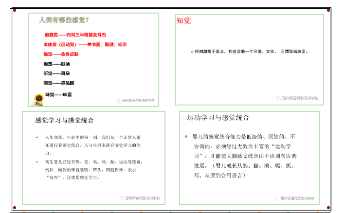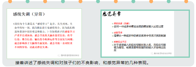 張老師從人類有哪些感覺入手開始講解,引出什么是知覺,以及感覺學(xué)習(xí)、運(yùn)動學(xué)習(xí)與感覺統(tǒng)合的關(guān)系。