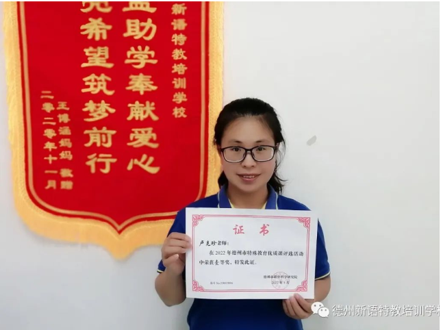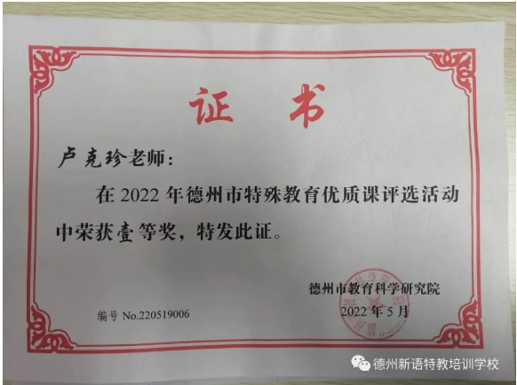 賀德州新語(yǔ)特教學(xué)校盧克珍老師參加2022年德州市特殊教育優(yōu)質(zhì)課評(píng)選活動(dòng)榮獲一等獎(jiǎng)。