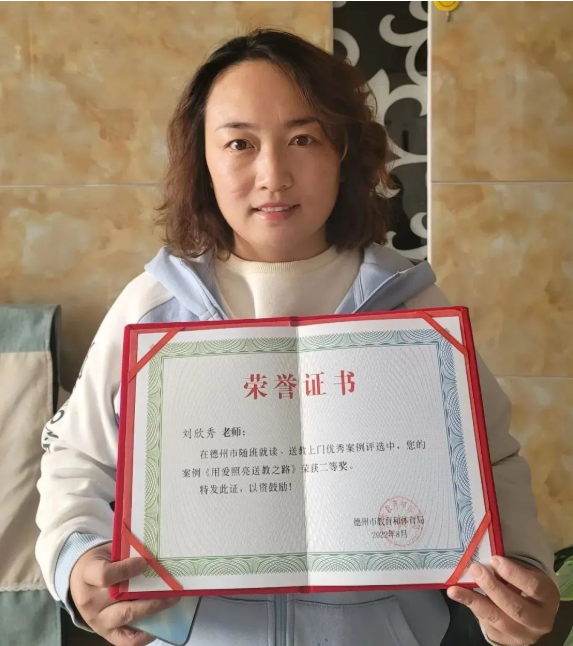 劉欣秀老師在德州市隨班就讀、送教上門優(yōu)秀案例評選中,榮獲二等獎(jiǎng)。劉老師自2016年入職德州新語,2019年起,她第一批加入送教團(tuán)隊(duì),為孩子們送教上門,她用心幫助每一個(gè)貧困殘疾人家庭,做到了用愛點(diǎn)亮送教之路。
