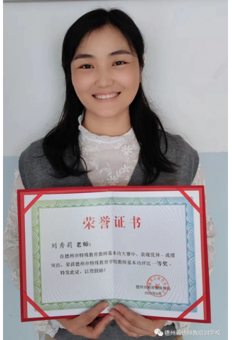 劉秀莉老師榮獲德州市特殊教育學(xué)校教師基本功評比一等獎(jiǎng)。劉秀莉老師自2005年入職德州新語,她用扎實(shí)的理論知識,豐富的教學(xué)經(jīng)驗(yàn),幫助了一批又一批特殊兒童,助力孩子們成長進(jìn)步。