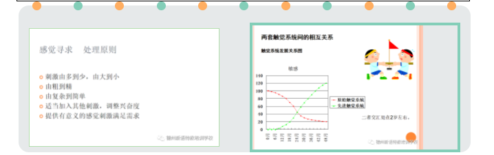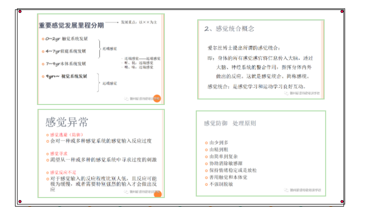 張老師從重要感覺發(fā)展歷程分期開始講解,讓家長們了解一般兒童的發(fā)展規(guī)律,不同的年齡段會有不同的活動側重,不同活動對孩子的不同影響,感覺異常對孩子的不良影響,說明感覺統(tǒng)合對孩子的重要性。