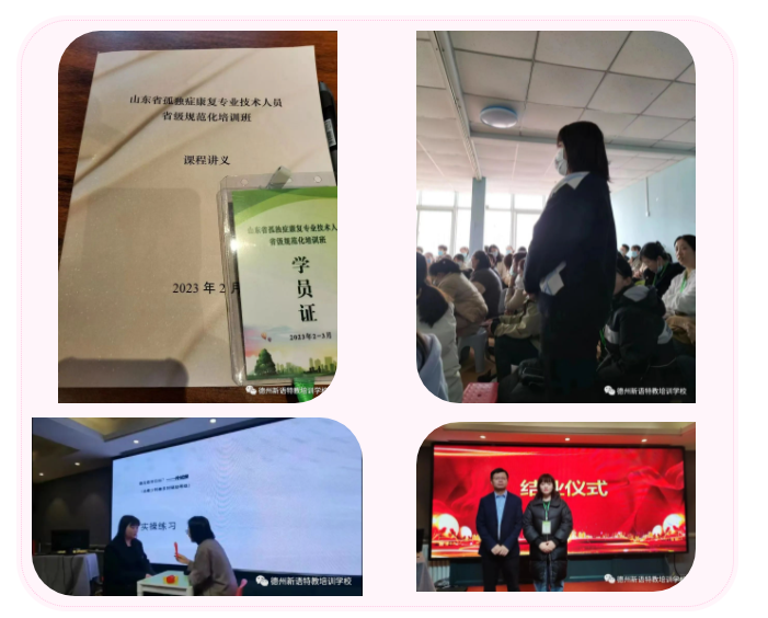 為加強全省孤獨癥兒童康復專業(yè)技術人員業(yè)務技能培訓,提升兒童康復服務規(guī)范化水平,2023年2月27日--3月18日,由山東省殘疾人聯(lián)合會舉辦的“全省孤獨癥兒童康復專業(yè)技術人員線下康復技術培訓班”在濟南召開,德州新語特教學校劉雪琪老師參加了此次培訓。