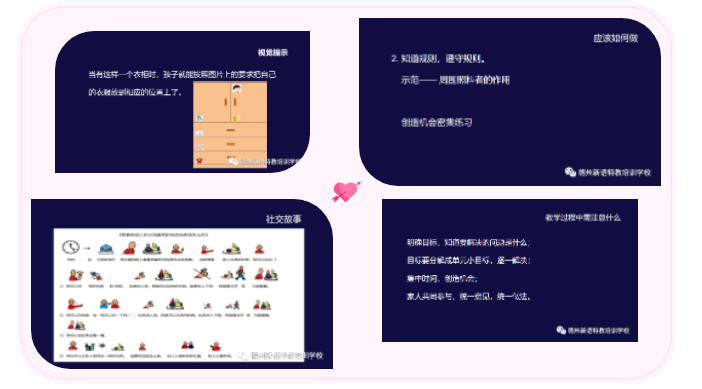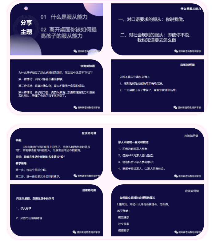 通過(guò)舉例說(shuō)明提高孩子服從能力的教學(xué)策略,講述分析問(wèn)題的原因要從環(huán)境、距離、寶貝的理解力入手,請(qǐng)家長(zhǎng)們根據(jù)自己家情況具體問(wèn)題具體分析。引出社交故事的使用方法,圖文并茂提高孩子的興趣,進(jìn)而通過(guò)學(xué)習(xí)提高孩子的服從能力。