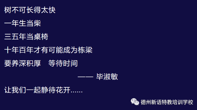 最后,引用畢淑敏的一段話“樹不可長(zhǎng)得太快,一年生當(dāng)柴,三五年當(dāng)桌椅,十年百年才可能成為棟梁,要養(yǎng)深積厚,等待時(shí)間?!闭?qǐng)家長(zhǎng)們沉住氣,要想讓孩子真正的習(xí)得技能,不是一朝一夕的事,要養(yǎng)深積厚,功到自然成!