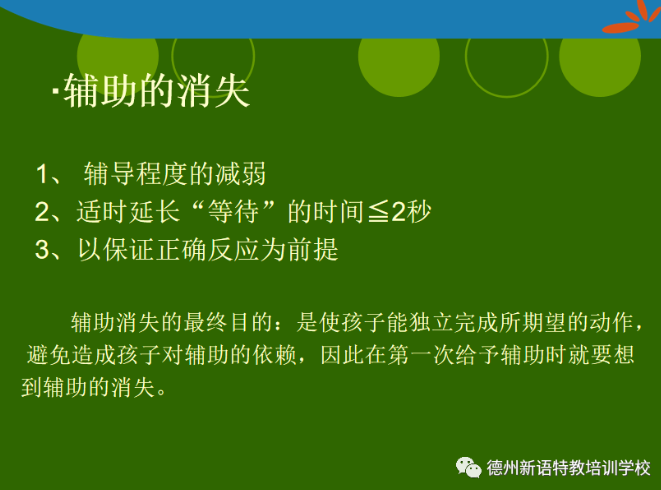 最后,強(qiáng)調(diào)輔助是促進(jìn)孩子習(xí)得技能的一個(gè)方法,輔助的消失才是孩子真正習(xí)得技能、能力提升的表現(xiàn),因此在第一次給與輔助時(shí)就要想到輔助的消失。