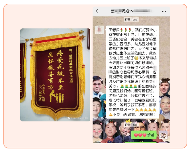 7月13日上午,學(xué)校收到一面“疼愛(ài)無(wú)微不至,關(guān)懷教導(dǎo)有方”的錦旗,原來(lái)是小蔡(化名)順利上普通幼兒園了,家長(zhǎng)特意為學(xué)校定制了錦旗表達(dá)對(duì)新語(yǔ)學(xué)校老師們的感激之情。